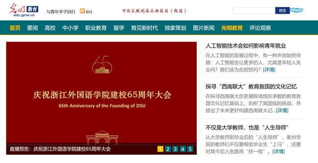 光明网在首页焦点图显示、光明网教育频道首页直播学校庆祝大会。