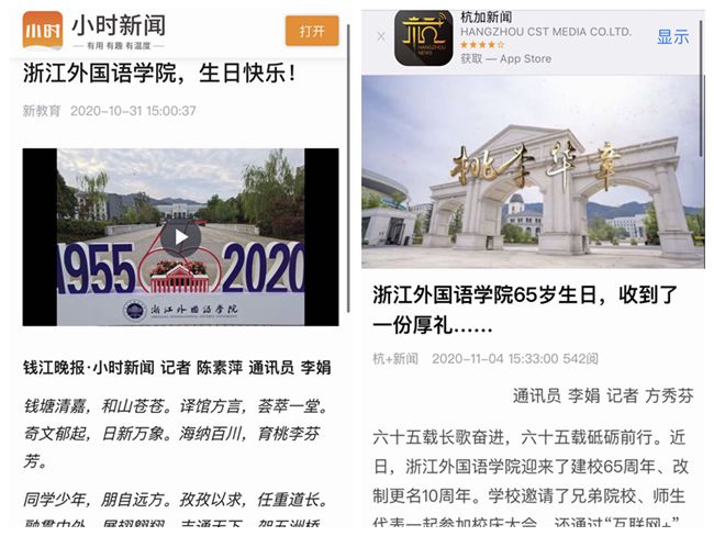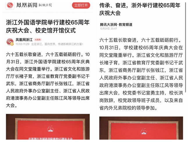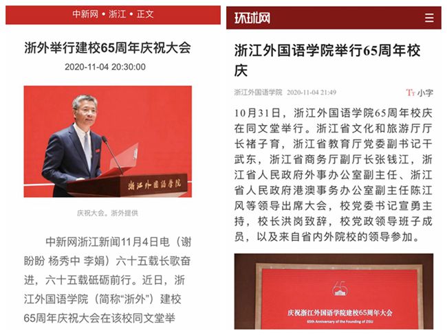 中新网、环球网、凤凰网等多家媒体分别以“浙外举行建校65周年庆祝大会”“浙外校史馆揭幕 展示65年办学历程”“浙江外国语学院举行建校65周年庆祝大会、校史馆开馆仪式”等为题,对学校65周年校庆进行了关注报道。